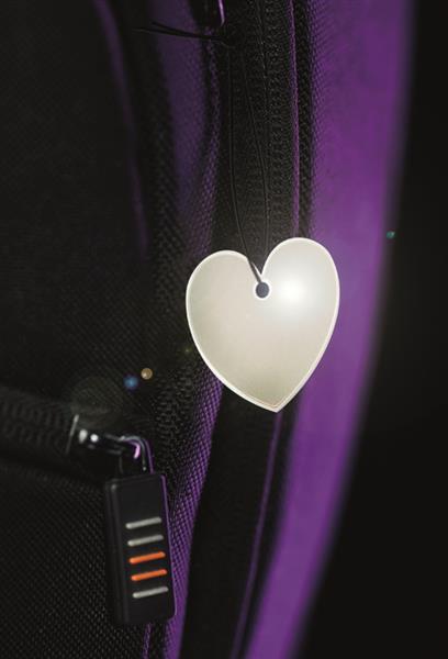 Zawieszka REF-HEART w kształcie serca to prosty, a zarazem wyrazisty dodatek, który umożliwia estetyczną prezentację nadruku. Wyposażona w zaczep, z łatwością może zostać przypięta do ubrania, plecaka czy torby. Zawiera elementy o właściwościach odbijających światło, które zwiększają jej funkcjonalność po zmroku. Produkt wyprodukowany w Unii Europejskiej, zgodny z wymaganiami rozporządzenia REACH – nie zawiera substancji z listy SVHC, w tym ftalanów.