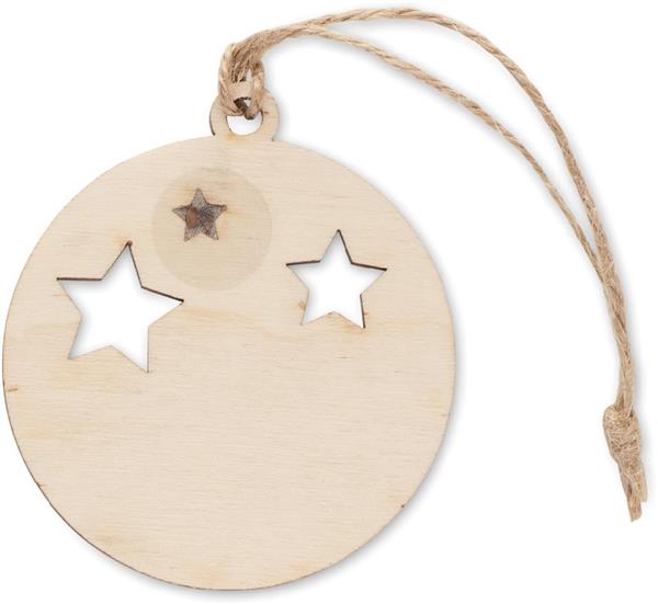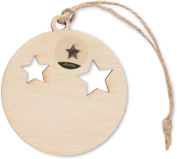 Drewniana, okrągła zawieszka dekoracyjna z jutowym sznurkiem zawierającym nasiona świerku. Prezentowana w kopercie kraft.