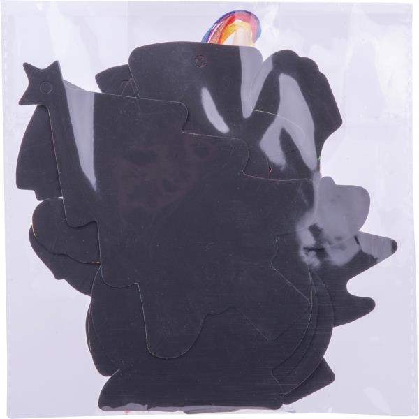 Świąteczne dekoracje, ze sznurkiem do zawieszenia, do kreatywnego projektowania. Ozdoby mają czarną powłokę, którą można zdrapać dołączonym drewnianym rysikiem, aby odsłonić kolory znajdujące się pod spodem. ET(N1) etykieta do 29 cm2: 5 x 5