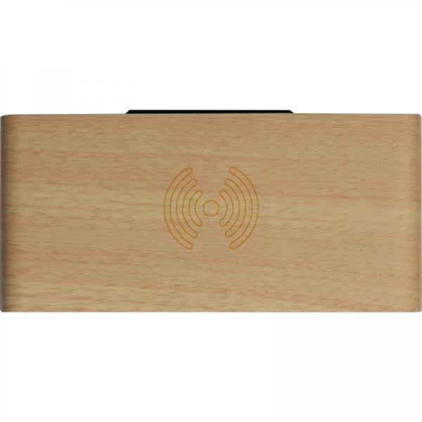 Zegar na biurko wykonany z drewna i plastiku, z termometrem i bezprzewodową ładowarką.