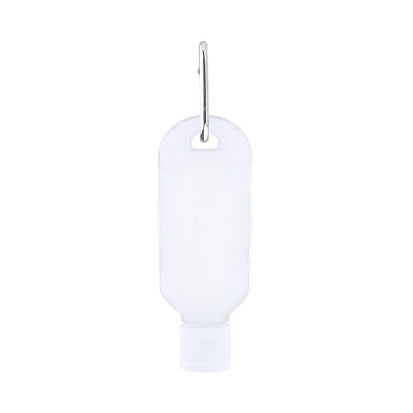 Żel do rąk w półprzezroczystej buteleczce (do wielokrotnego napełniania) z dozownikiem z zamknięciem i karabińczykiem, roztwór o 65% zawartości alkoholu, 30 ml