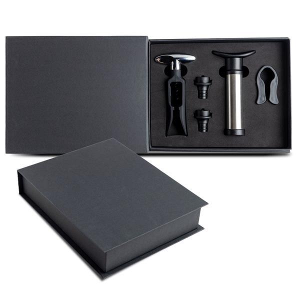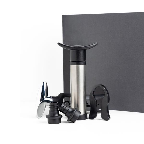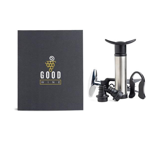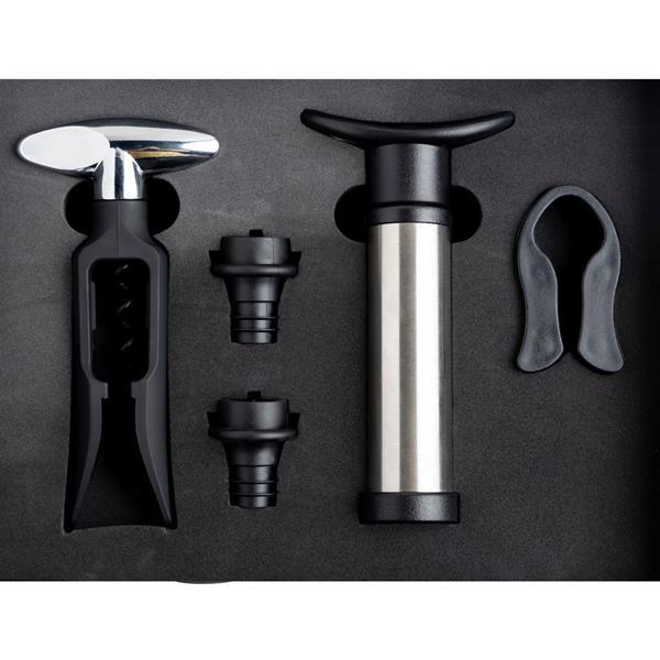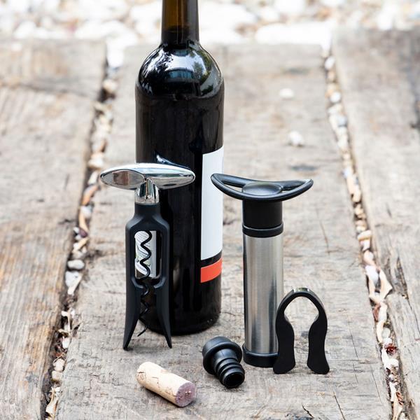 Zestaw do wina z pompką, zatyczkami próżniowymi, korkociągiem i nożem. To idealny prezent dla każdego konesera wina. Kompletny zestaw oferujący w eleganckim magnetycznym pudełku prezentowym nożyczki do kapsli i korkociąg, aby przygotować wino, oraz dwie zatyczki i pompkę próżniową, aby przechowywać je bez wpływu na jego właściwości. Od początku do końca w towarzystwie tego wyjątkowego prezentu. Wznosimy toast za życie!