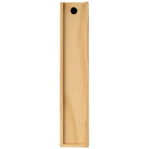 Zestaw zawiera: 12 kredek w drewnianym pudełku ze zdejmowaną pokrywką, która może posłużyć jako linijka. Nadruk niemożliwy na poszczególnych elementach.