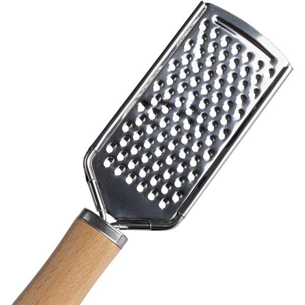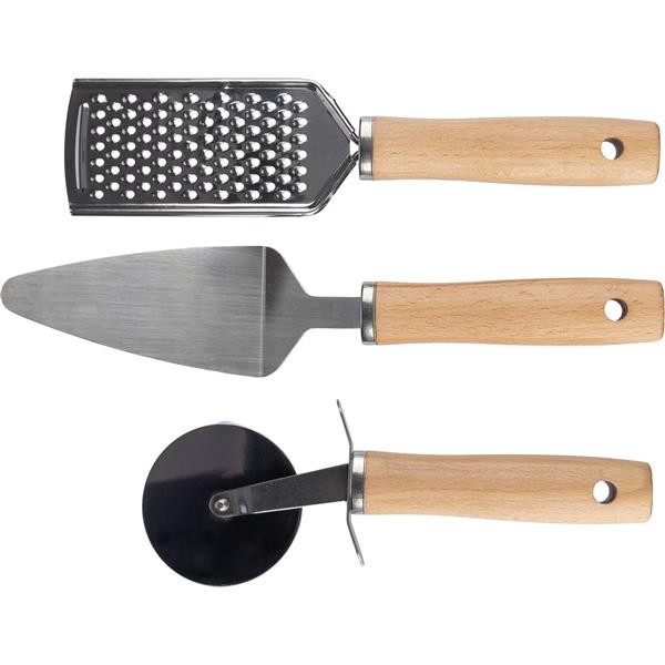 Zestaw akcesoriów kuchennych, w skład którego wchodzą: tarka ze stali nierdzewnej, łopatka do ciasta oraz nóż do pizzy, każdy z drewnianą rączką, nie nadają się do mycia w zmywarce, zapakowane w bawełniany woreczek ze sznurkiem ściągającym, produkt wykonany z metalu i drewna