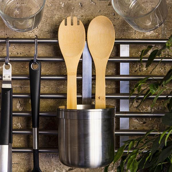 Zestaw bambusowych łyżek do sałatek, zapakowane w bawełniany woreczek