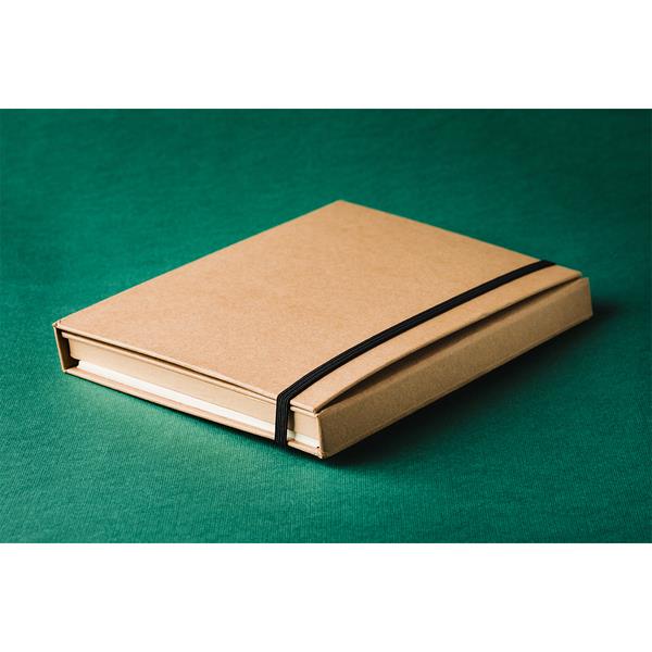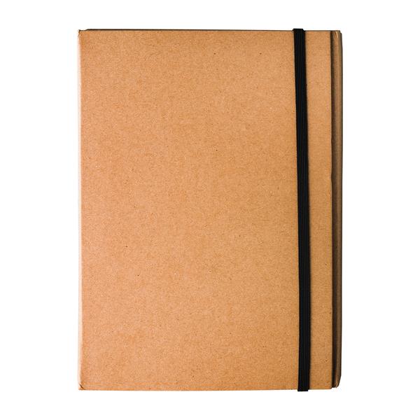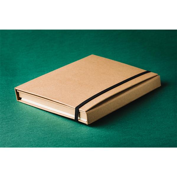 Ekologiczny zestaw biurkowy w oprawie z kartonu zamykany taśmą. W skład zestawu wchodzi 40-kartkowy notatnik w linie, drewniana linijka, długopis, gumka do zmazywania, temperówka, 2 ołówki, karteczki samoprzylepne i flagi samoprzylepne w 5 kolorach. Dodatkowa kieszonka z linijką.