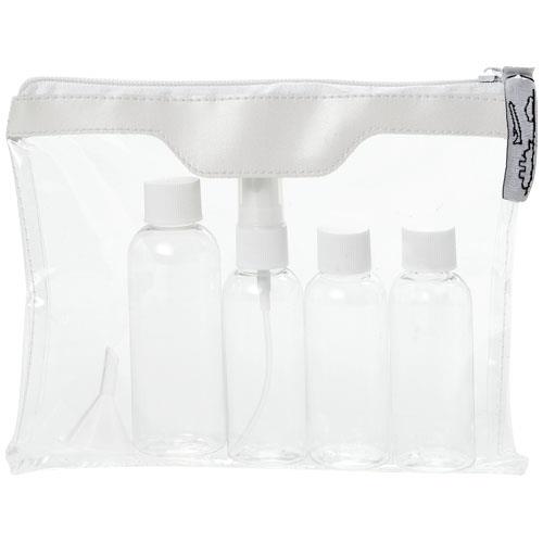 Zatwierdzona przez linie lotnicze transparentna kosmetyczka, której zawartość można wnieść na pokład. Zawiera: 2 puste buteleczki 50 ml, 1 pustą buteleczkę 80 ml, atomizer oraz lejek. Buteleczki, atomizer i lejek zapakowane oddzielnie od etui. Nadruk niemożliwy na poszczególnych elementach.