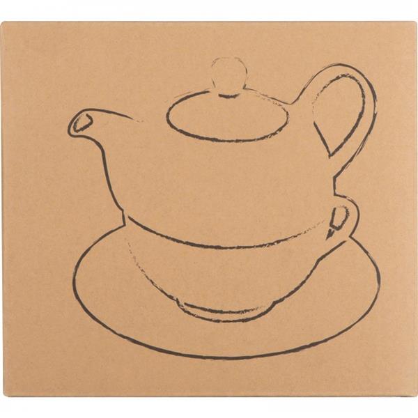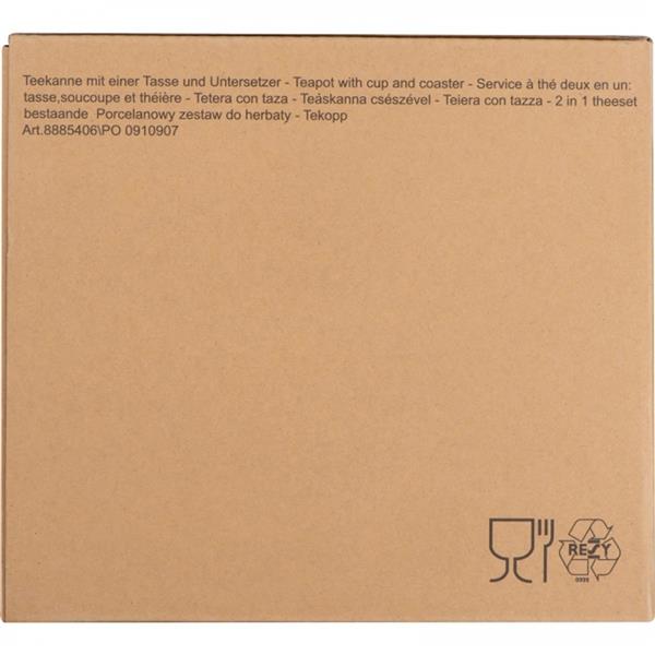 Zestaw do herbaty składający się z czajnika (poj. 400 ml) oraz filiżanki z podstawką (poj. 200 ml). Całość wykonana z porcelany.