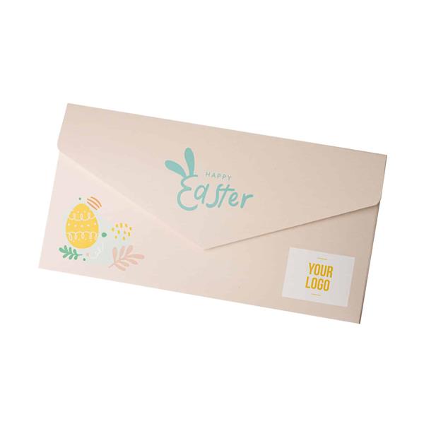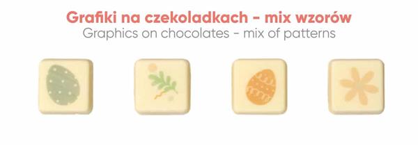 Ta koperta skrywa aż 24 różne czekoladki – Twoje słodkie życzenia wielkanocne. O ich treści decydujesz sam, a dodatkowo na wybranych przez siebie, białych czekoladkach, możesz dodać kolorowe zdobienie wykonane barwnikami spożywczymi: jadalnymi i bezpiecznymi.