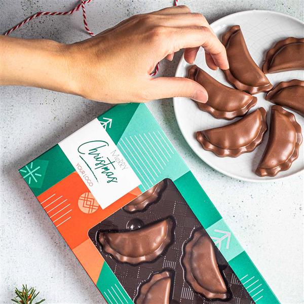 Czekoladowe pierogi reklamowe z logo to unikalny i oryginalny sposób na promocje Twojej marki i nawiązanie do tradycji Świąt Bożego Narodzenia. Zestaw czekoladek w kształcie pierogów zachwyca kreatywnym wyglądem i na długo zapada w pamięć. Polecamy ten produkt jako wyjątkowy upominek świąteczny od firmy.