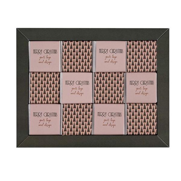 Zestaw czekoladek Frame Box Maxi 12 szt. to duży zestaw czekoladek na specjalne okazje biznesowe. Składa się z 12 starannie dobranych pralin o różnorodnych smakach: aksamitnej czekolady mlecznej, intensywnej gorzkiej oraz białej czekolady. Ten zestaw zaspokoi gusta nawet najbardziej wymagających koneserów. Każda pralina jest osobno zapakowana, co dodatkowo podkreśla ekskluzywny charakter produktu.