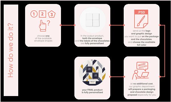 Koperta kształtowa, dołączona do zestawu czekoladek, wykonana jest z papieru z certyfikatem FSC, do wyboru oferujemy opcje: biały, kraft lub ecru – z dodatkiem włókien trawy. Szata graficzna opakowania podlega całkowitej personalizacji – więc zastanów się, jak chcesz wykorzystać tę powierzchnię reklamową.