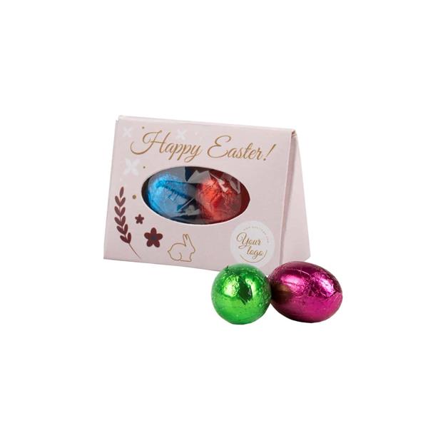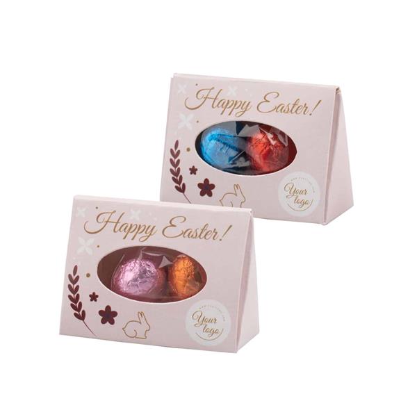 Ta mini torebeczka z dwiema czekoladowymi pisankami to świetny pomysł na upominek zwłaszcza dla tych, którzy cenią sobie dbałość o każdy szczegół firmowego prezentu, nawet tego najmniejszego.