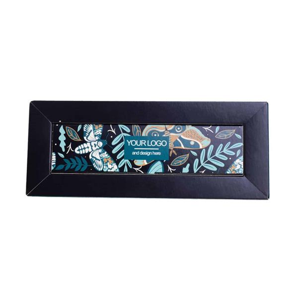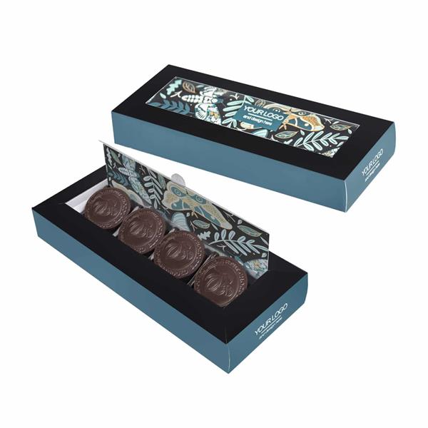 Opakowanie wykonujemy z białego lub kraftowego papieru z certyfikatem FSC i w pełni personalizujemy nadrukiem cyfrowym. Czekoladę zaś zabezpieczamy wypraską z R-PET, która w 100% nadaje się do ponownego recyclingu.