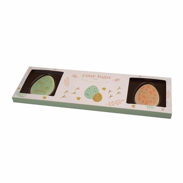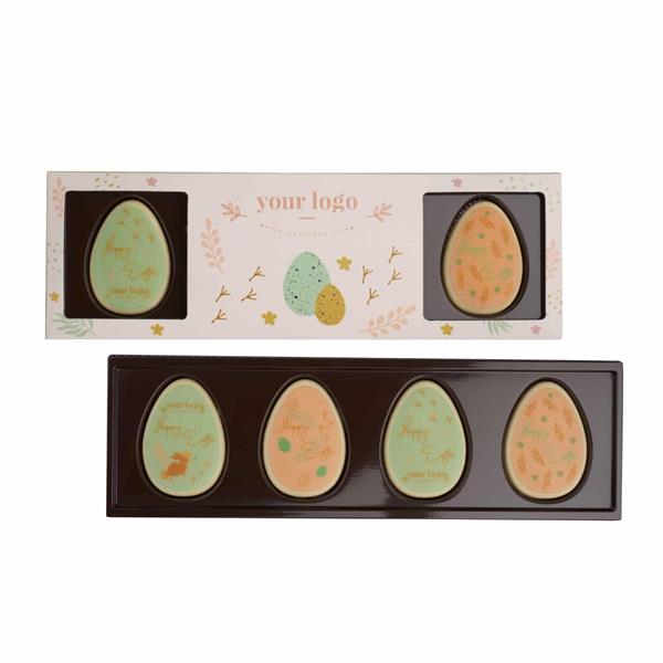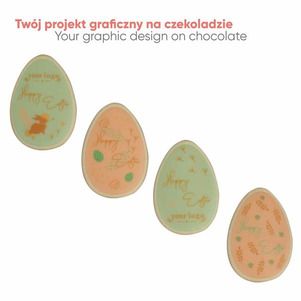 To cztery jajeczka z aksamitnej białej czekolady i każde z nich możemy ozdobić inną grafiką czy hasłem.