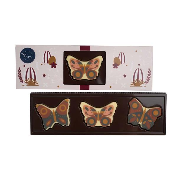 Asortyment trzech czekoladowych motylków to wiosenna propozycja dla marek ceniących design i świeże spojrzenie na firmowy gadżet.