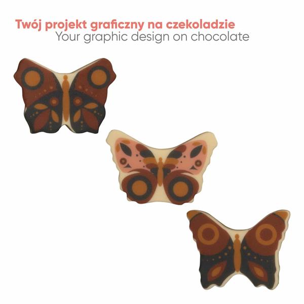Każdy z motylków różni się kształtem i zdobieniem, ale kolorystykę i wzór dekoracji na czekoladkach pozostawiamy Twojej decyzji i z przyjemnością dostosujemy go do Twojego projektu, kolorów Twojej firmy czy grafiki kampanii, jaką prowadzisz. Nie ograniczamy Twojej wyobraźni i potrzeb, a każdego motylka możemy ozdobić inną grafiką.