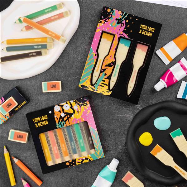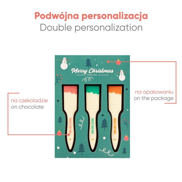 ZESTAW CZEKOLADEK Z NADRUKIEM PĘDZLE 3 SZT. składa się z trzech pysznych, białych czekoladek w kształcie pędzli. Kreatywność designu, wyjątkowych smak białej czekolady oraz ponadprzeciętne opcje personalizacji to największe atuty tego zestawu. Każdą czekoladkę możemy ozdobić kolorowymi wzorami na życzenie klienta.