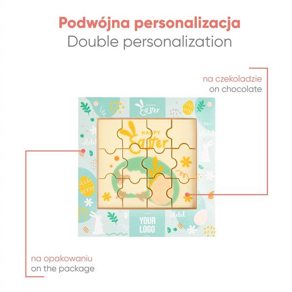 Skorzystaj z możliwości podwójnej personalizacji – bezpośrednio na powierzchni czekolady oraz na opakowaniu – by stworzyć niepowtarzalny słodki gadżet firmowy dopasowany do Twojej marki.