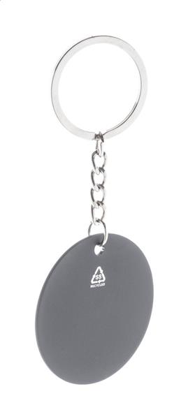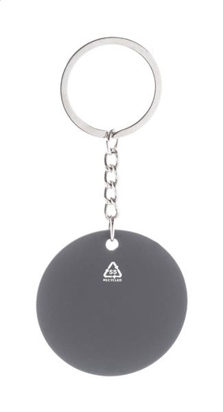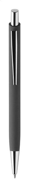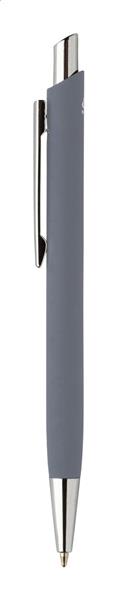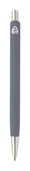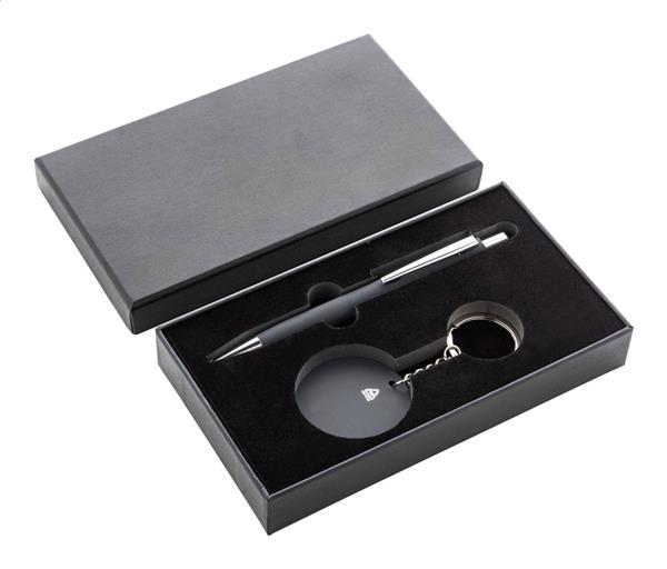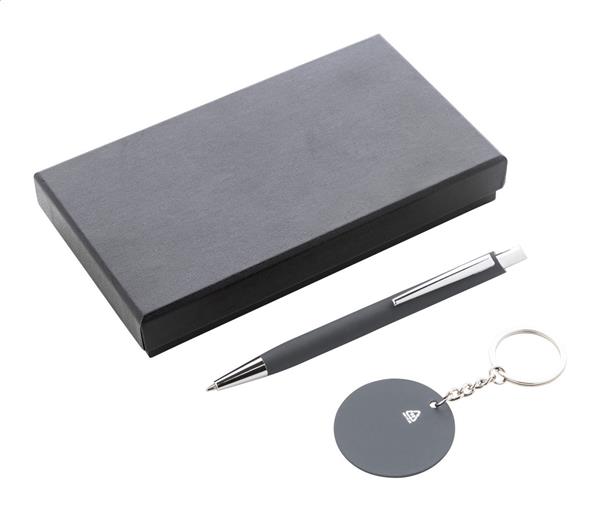 Zestaw upominkowy składający się z 2 części w czarnym papierowym pudełku. Zawiera długopis z recyklingowanego aluminium z gumowanym wykończeniem i niebieskim wkładem oraz brelok ze stali nierdzewnej z recyklingu z gumowanym wykończeniem. Oba przedmioty mają specjalną powłokę do grawerowania laserowego lustrzanego.