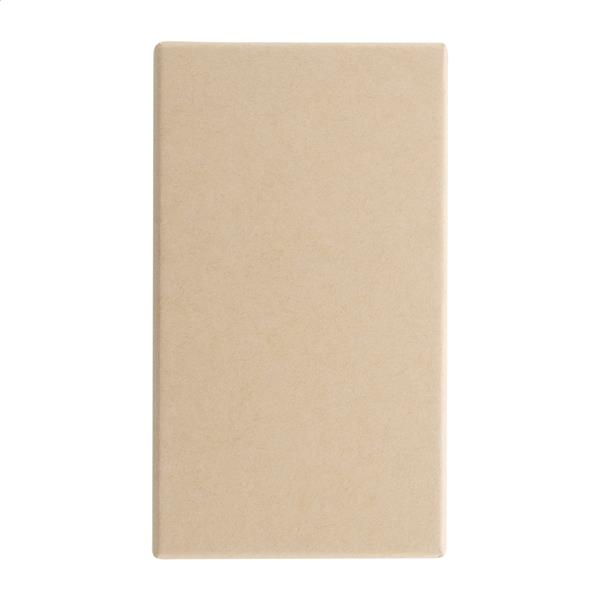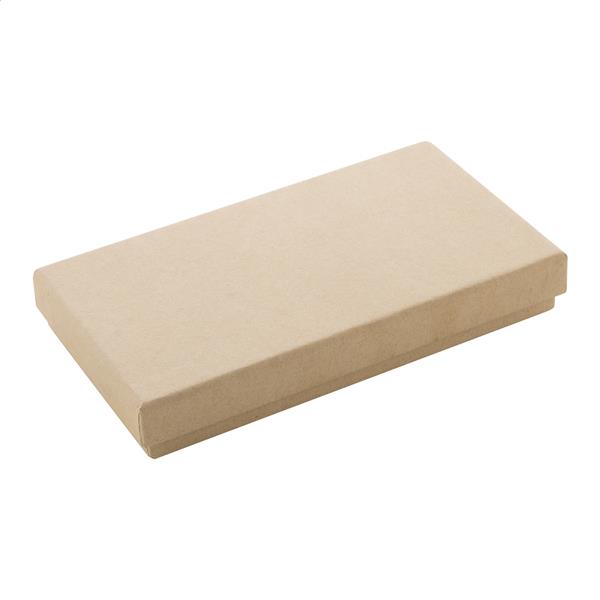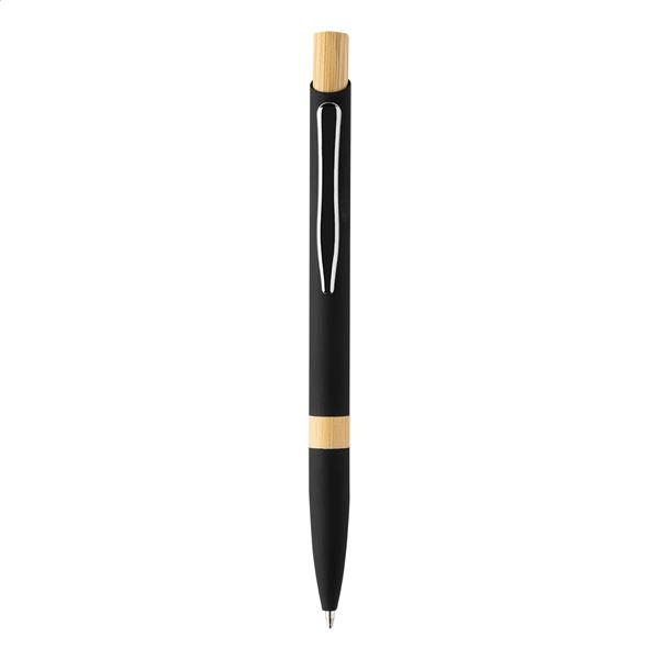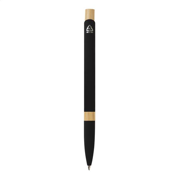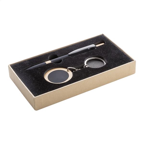 Zestaw upominkowy składający się z 2 części w pudełku prezentowym z papieru kraft. Zawiera długopis z recyklingowanego aluminium z detalami z bambusa, gumowane wykończenie i niebieski wkład oraz brelok z bambusa z gumowaną płytką ze stali nierdzewnej z recyklingu. Oba przedmioty mają specjalną powłokę do grawerowania laserowego lustrzanego.