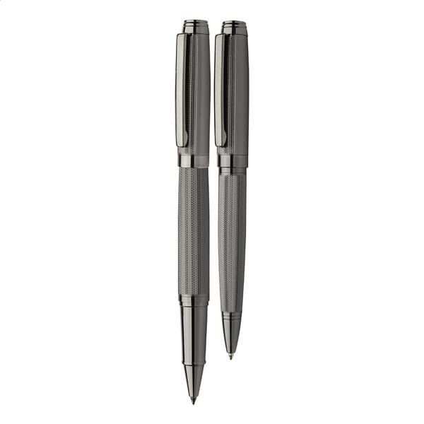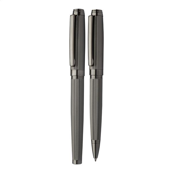 Elegancki, metalowy zestaw składający się z długopisu i pióra kulkowego z wzorami na korpusach. W czarnym pudełku upominkowym, z niebieskim wkładem. Produkt marki André Philippe.