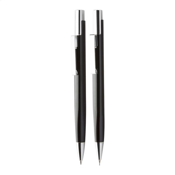 Aluminiowy zestaw długopis i ołówek techniczny w czarnym pudełku prezentowym. Zawiera niebieski wkład i rysiki 0,7 mm.