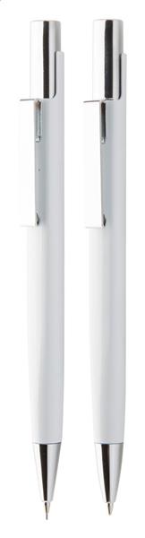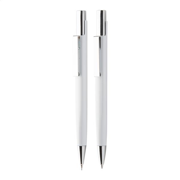 Aluminiowy zestaw długopis i ołówek techniczny w czarnym pudełku prezentowym. Zawiera niebieski wkład i rysiki 0,7 mm.
