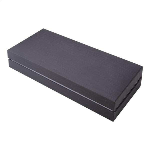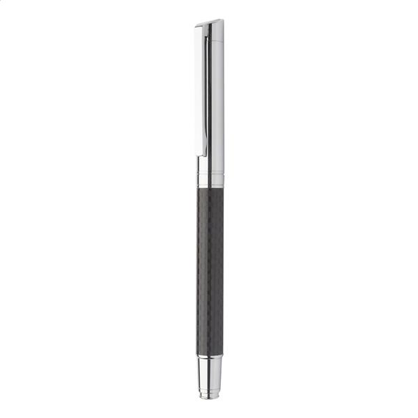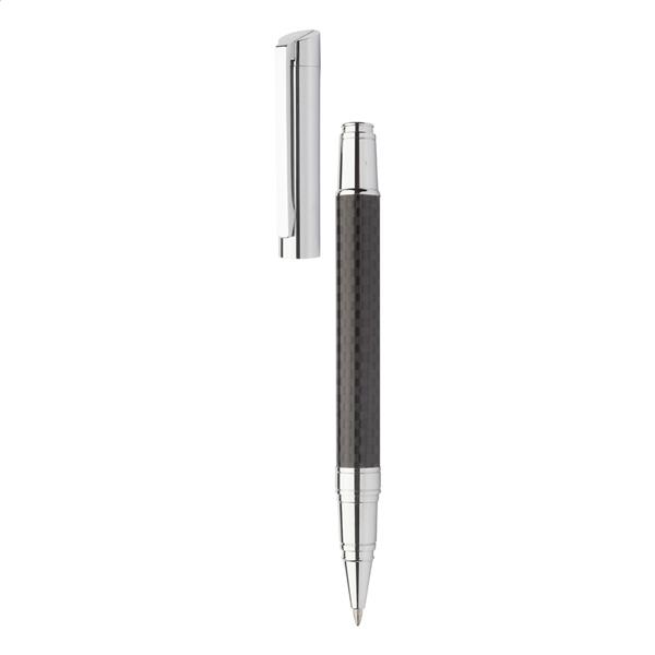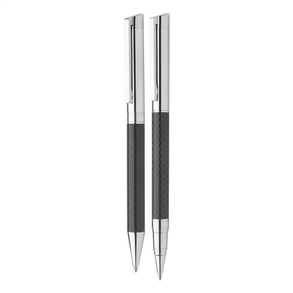 Elegancki, metalowy zestaw: długopis i pióro kulkowe, z korpusem z wzorem karbonowym i błyszczącymi chromowanymi częściami. W czarnym pudełku upominkowym, z niebieskim wkładem. Produkt marki André Philippe.