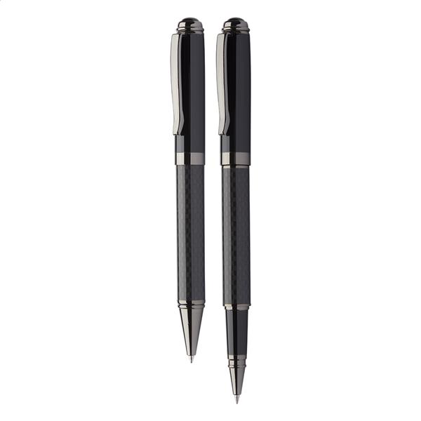 Elegancki zestaw: metalowy długopis i pióro kulkowe z wykończeniem na wzór karbonowego. W czarnym opakowaniu, z niebieskim wkładem. Produkt marki Andre Philippe.