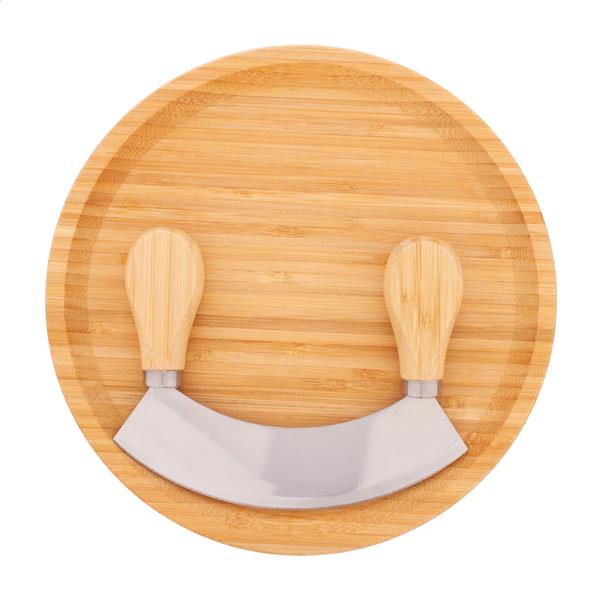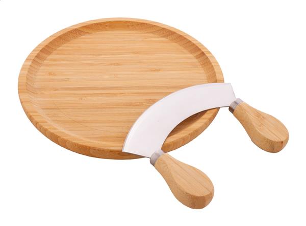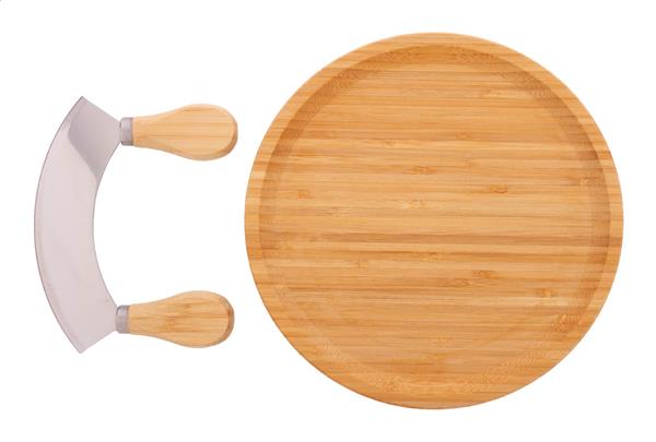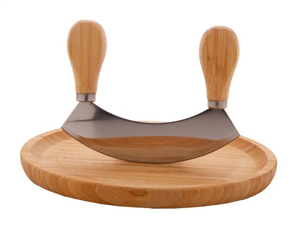 Bambusowy zestaw do krojenia ziół, zawierający okrągłą bambusową deskę do krojenia i krajalnicę do ziół ze stali nierdzewnej z bambusowymi uchwytami.