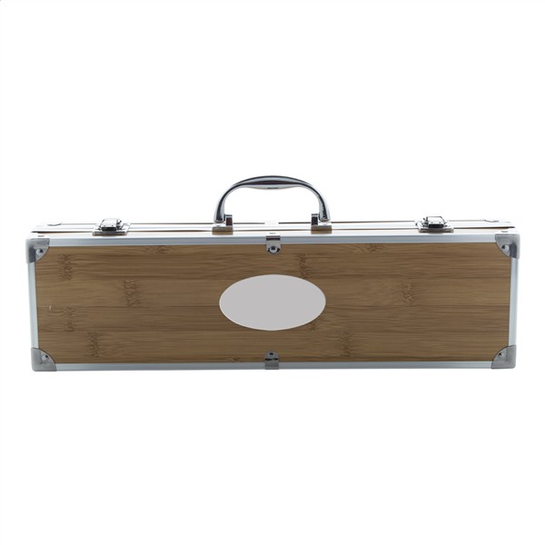 Zestaw do grilla ze stali nierdzewnej i bambusa (widelec, szczypce i łopatka z otwieraczem do butelek). W walizce aluminiowej z bambusowym wzorem.