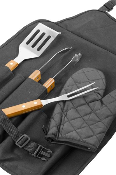 Zestaw narzędzi do grillowania w komplecie z rękawicą oraz fartuchem, który pełni także rolę etui. Zestaw składa się z najbardziej potrzebnych przy grillowaniu przyrządów: szczypiec, widelca i łopatki. Fartuch ochroni odzież przed plamami, a rękawica zabezpieczy przed oparzeniami.