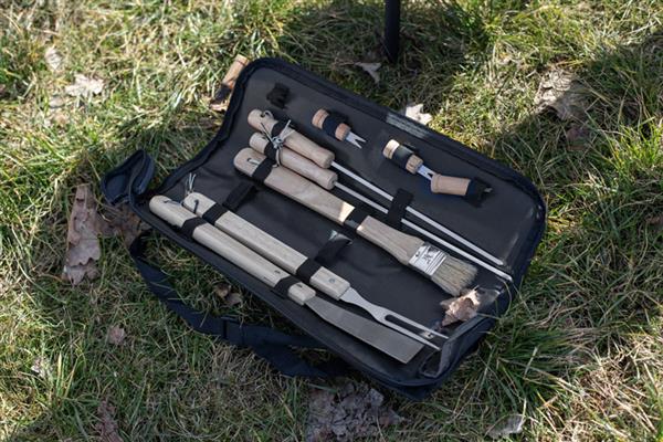 Zestaw do grilla RIVA w poliestrowym etui zawiera 10 elementów z drewnianymi rączkami: 2 szpikulce do szaszłyków, szczypce, łopatkę, widelec oraz 4 uchwyty do kolb kukurydzy.