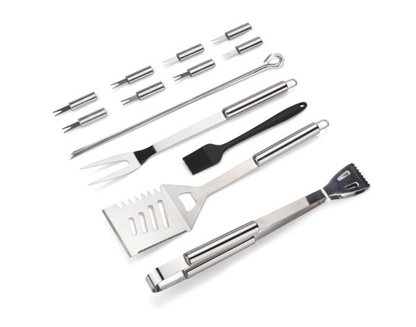 Zestaw do grilla ROLAN w poliestrowym etui zawiera 16 elementów ze stalowymi rączkamii: 4 szpikulce do szaszłyków, szczypce, łopatkę z otwieraczem do butelek, widelec, 8 uchwytów do kolb kukurydzy oraz silikonowy pędzelek.