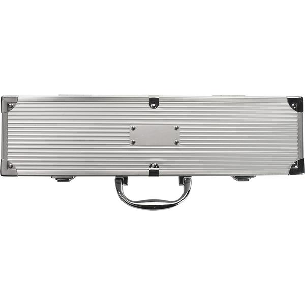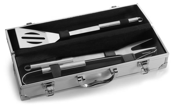 Zestaw do grilla w aluminiowej skrzynce, łopatka, widelec do mięsa oraz szczypce