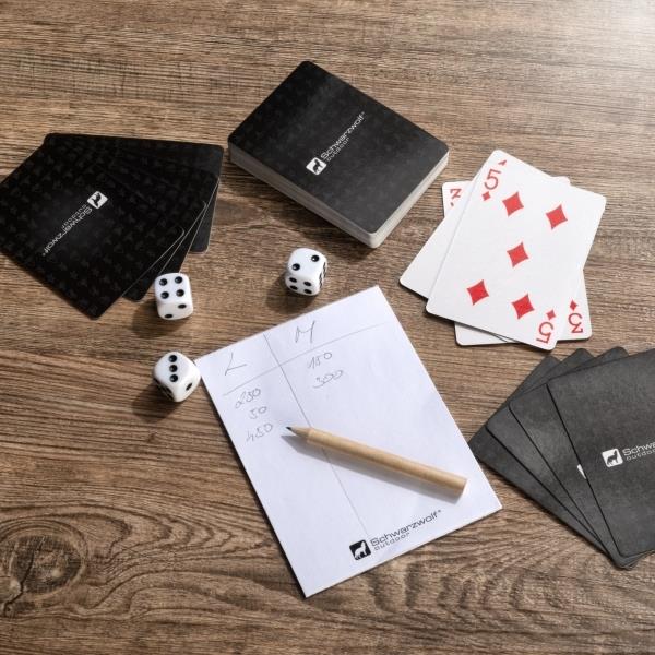 Zestaw podróżny do gry w karty i kości, zapakowany w blaszane pudełko. Zestaw składa się z 2 talii 54 kart z wodoodporną powierzchnią, 6 kości do gry i 15 karteczek do notowania oraz ołówek.