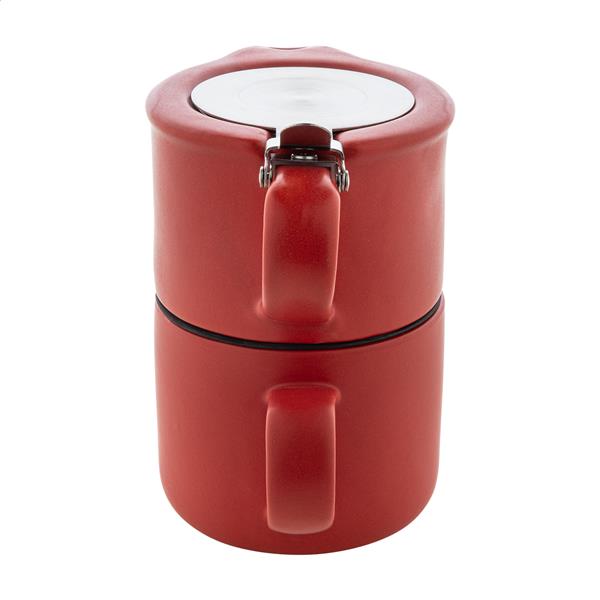 Wysokiej jakości ceramiczny zestaw do herbaty z matowym wykończeniem. W zestawie czajniczek (430 ml) z pokrywką ze stali nierdzewnej i sitkiem do herbaty, zaprojektowany tak, aby można go było ustawić na pasującym kubku (400 ml). W pudełku z papieru kraft.