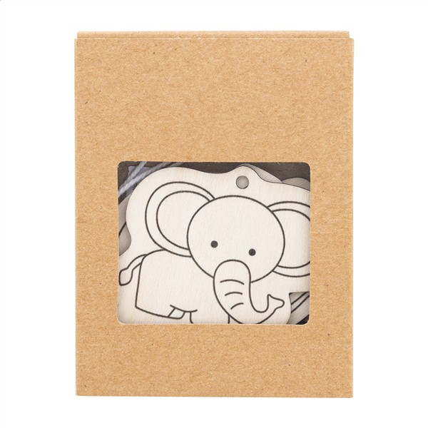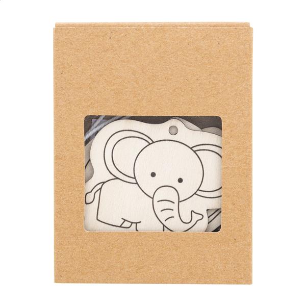 Zestaw do kolorowania, 3 drewniane figurki zwierząt, w tym 4 drewniane kredki i sznurki do zawieszania. W pudełku z papieru kraft.