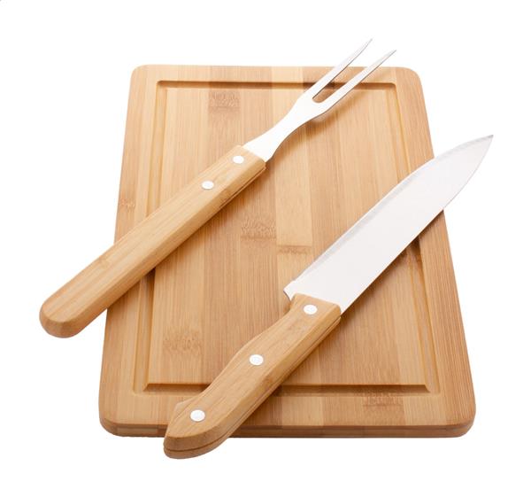 Bambusowy zestaw do krojenia mięsa z bambusową deską do krojenia, widelcem ze stali nierdzewnej i nożem z bambusowymi uchwytami.