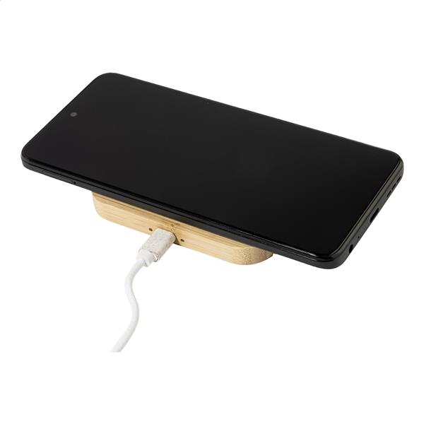 Zestaw kabli USB do ładowania z ekologicznego plastiku ze słomy pszenicznej z bezprzewodową, szybką ładowarką (15 W) w magnetycznym etui bambusowym z paskiem do noszenia. W zestawie kabel USB-C z adapterami USB, micro USB i Lightning.