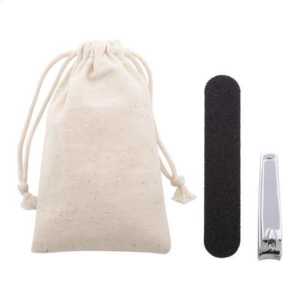 Zestaw do manicure w bawełnianym etui. Zawiera pilnik do paznokci i obcinacz do paznokci.