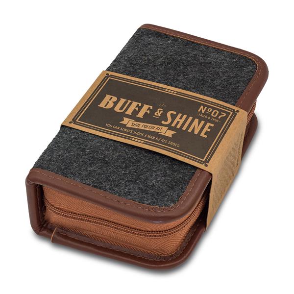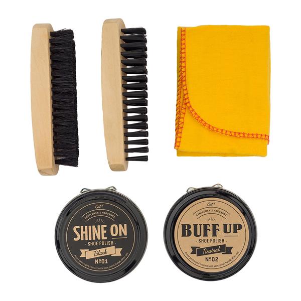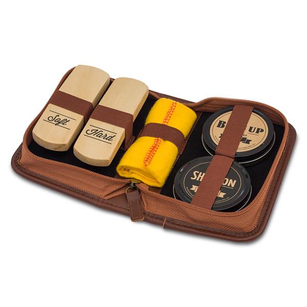 Zestaw do pielęgnacji obuwia w eleganckim etui. Zawiera pastę do butów czarną i bezbarwną, dwie szczotki (twardą i miękką) oraz szmatkę do polerowania.