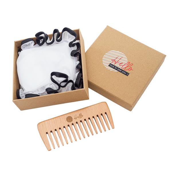 Zestaw do pielęgnacji włosów. Składa się z czepka kąpielowego wielorazowego użycia oraz grzebienia wykonanego z drewna bukowego, przeznaczonego do rozczesywania mokrych włosów oraz do rozprowadzania odżywki. Szeroko rozstawione zęby grzebienia nie szarpią i nie łamią mokrego włosa. Czepek nałożony na włosy z odżywką pomaga w lepszym wchłanianiu się w strukturę włosa.