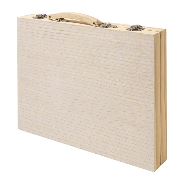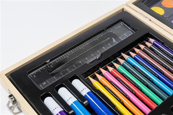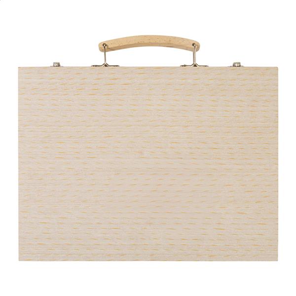 Kompleksowy, 66-elementowy zestaw do rysowania i kolorowania dla artystów w drewnianym pudełku. Zawiera: 12 kredek świecowych, 12 pasteli olejnych, 12 ołówków, 12 markerów, 12 farb akwarelowych z paletą i pędzlem, linijkę, gumkę, temperówkę i klej.