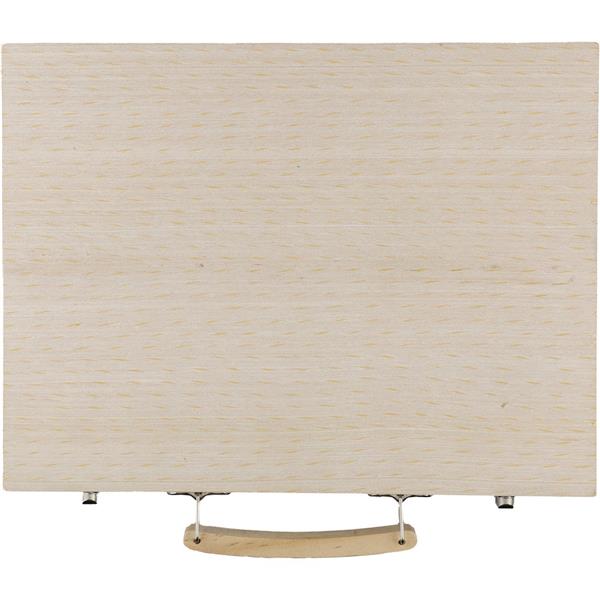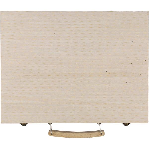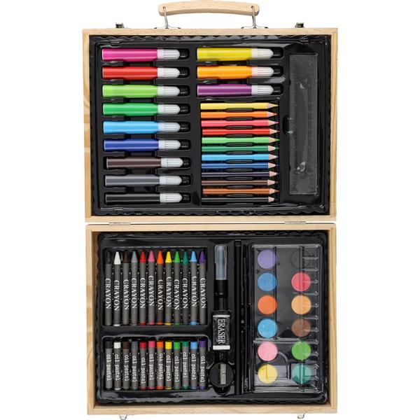 Zestaw do rysowania ze sklejki w sosnowej skrzynce z drewnianą rączką, zawierający 66 elementów: 12 kredek woskowych, 12 kredek ołówkowych (naostrzonych), 12 pisaków, 12 pasteli olejnych, klej w sztyfcie, gumkę do ścierania, temperówkę, linijkę, pędzel, 12 farb, paletę, pakowany pojedynczo w brązowe kartonowe pudełko