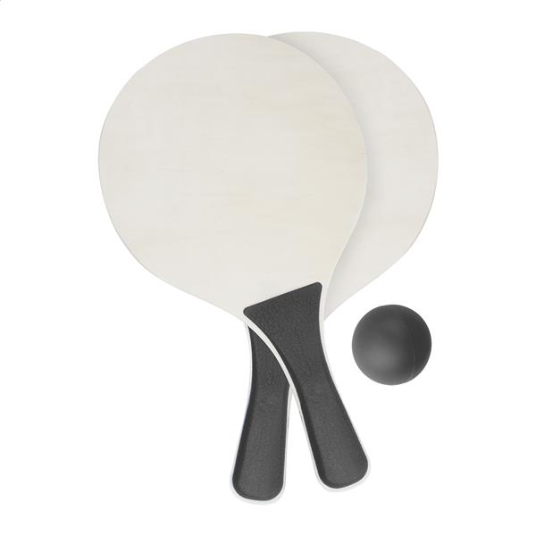 Zestaw do tenisa plażowego – 2 rakiety i 1 piłka, produkt wykonany z drewna i plastiku.