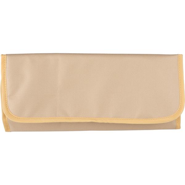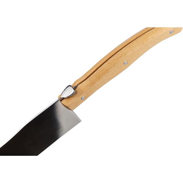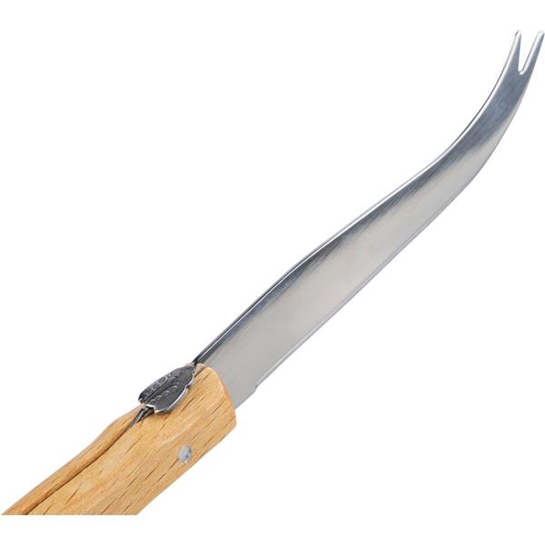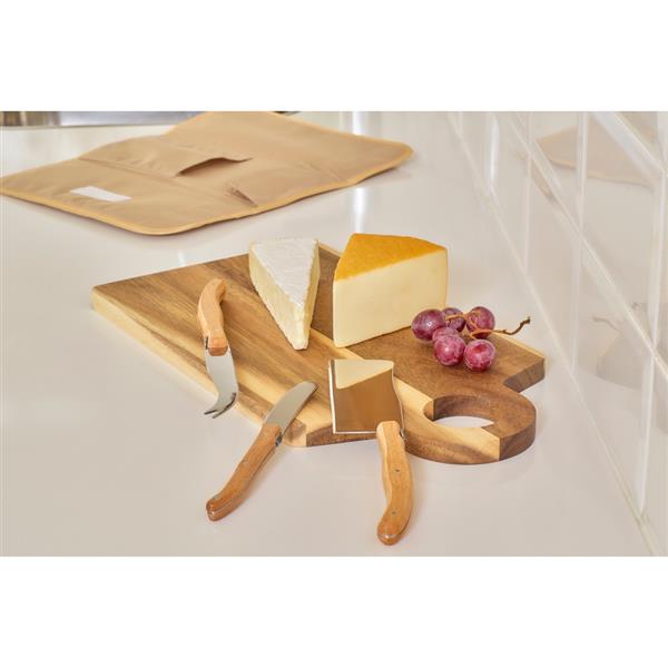 Zestaw do wędlin w etui zamykanym na rzep, zawierający trzy noże ze stali nierdzewnej z drewnianymi uchwytami, wewnątrz znajduje się ikona RPET na metce, bezpieczny w kontakcie z żywnością, indywidualnie pakowany w brązowe kartonowe pudełko, produkt wykonany z RPET