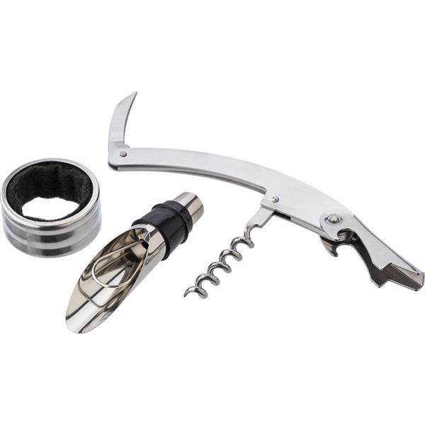 Zestaw do wina, 3 el. w pudełku w kształcie butelki, nóż kelnerski, zatyczka do butelki z nalewakiem, pierścień
