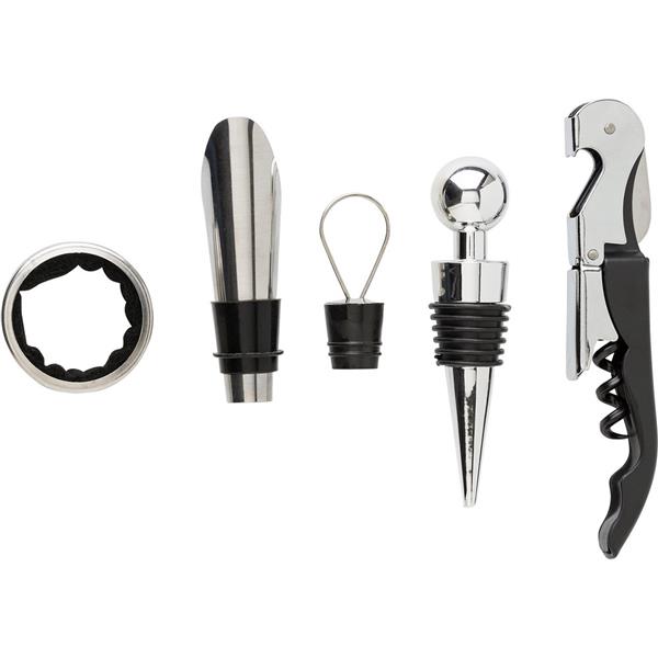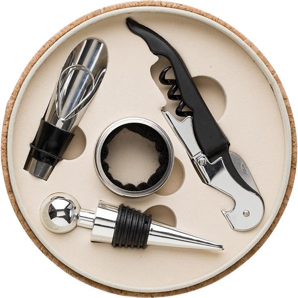 Zestaw do wina 4 el. w pudełku z korka, akcesoria do wina: nóż kelnerski, pierścień, zatyczka i nalewak
